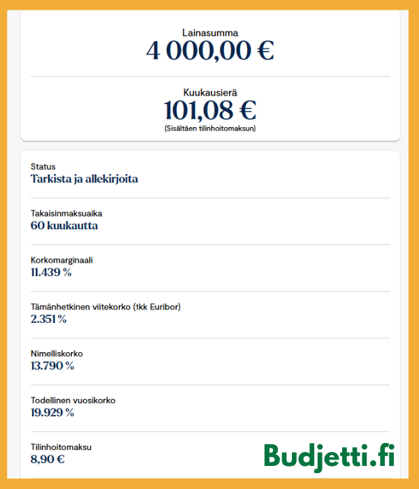 Tarjottu laina ei ollut erityisen edullinen, mutta huomioiden sen, että kyseessä oli vakuudeton laina, jota hain ilman rinnakkaishakijaa, niin ei se myöskään ollut varsinaisesti kallis.