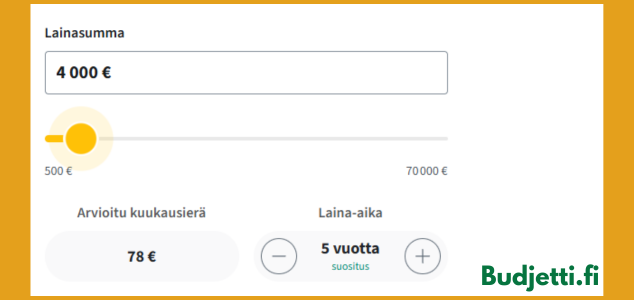 Axolainan lainahakemuksessa ilmoittama ennakkoarvio 4 000 euron 5 vuoden lainan kuukausierästä oli 78 euroa. Siis noin 23 euroa lopullista tarjousta pienempi.