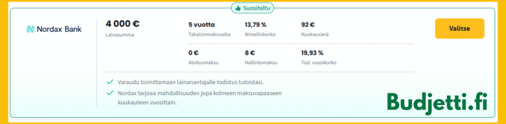 Käsittelyn myötä Axolaina onnistui löytämään yhden lainan ehdotettavaksi. Kyseessä oli Nordax Bankin laina. Laina oli lainasumman ja laina-ajan suhteen haluamani. Tuota voi pitää positiivisena, koska joskus lainavertailut löytävät vain sellaisia lainoja, joita ei hakenut.