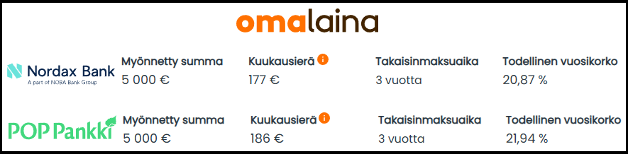 Kokeilin Omalainaa vuonna 2025 yhdistelylainaa varten. Omalaina onnistui löytämään kaksi yhdistelylainaa, jotka olivat kooltaan haluttu 5 000€ ja laina-ajaltaan haluttu 3 vuotta, mutta kolme muuta paikkaa onnistui löytämään vertaillussani halvemman yhdistelylainan.