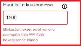 Pienenä outona juttuna Rahalaitoksen lainahakemuksessa tuli tosin itselleni vastaan se, että kohtaan "muut kulut kuukaudessa" koskien elinkustannuksia ei voi laittaa isompaa summaa kuin 999€. Kun huomioi, että kyseiseen kohtaan pitäisi laittaa kokonaissumma kaikista muista kuukautta kohden lasketuista kustannuksista kuin asumiskustannuksista, niin lienee oletettavaa, että on aika paljon ihmisiä, joiden kohdalla 999€ on todellista pienempi summa.