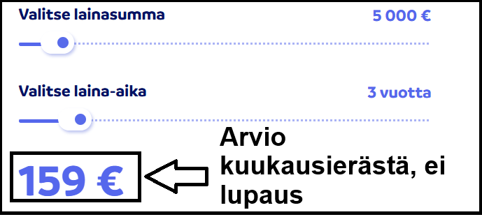 Kuva: sanoisin kokemusteni perusteella, että jos hakee 5 000€ lainaa 3 vuoden laina-ajalla Sortterin kautta ja sellaista tarjotaan, niin on sen kuukausierä varsin todennäköisesti isompi kuin 159€.