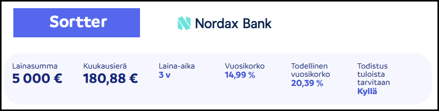 Vuonna 2025, kun hain 5 000 euron lainaa Sortterin kautta, niin myös sain tarjouksen juuri sellaista varten – joskus kilpailuttajat tarjoavat eri summaan lainaa kuin palvelun käyttäjä haki. Sortterin kautta vuonna 2025 tarjotun 5 000€ lainan todellinen vuosikorkoprosentti oli 20,39%.