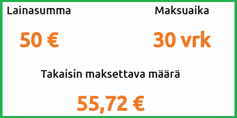 Taskulaina lähetti lainasta tiedot sähköpostilla. Niiden mukaan 50 euron lainasta 30 päivän maksuajalla pitää maksaa takaisin 55,76€. Ylivoimaisesti yllättävintä Taskulainan kuluihin liittyen oli se, että nopeasta rahojen siirrosta ei peritty mitään lisämaksua. Tuollaiset ovat nykyään erittäin yleisiä edelleen pienlainoja tarjoavien yritysten keskuudessa.